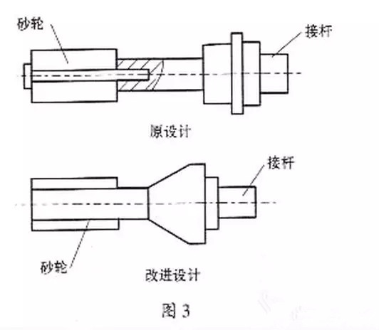 CBN砂輪內(nèi)圓磨削的最大問題是修整時磨削力的變化引起的變形,內(nèi)圓磨削的砂輪接桿本來就很弱,磨削力的任何變化都會引起接桿的變形,這些又將影響工件的尺寸、錐度和圓度。很多情況下,有些措施可使這個問題最小化,其中之一是重新設(shè)計砂輪接桿,通過減小長度、增大直徑、采用高剛性材料如鉬鋼或亞碳化鈦合金,圖3所示。