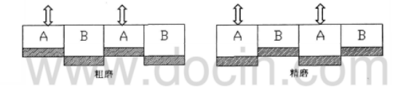 近年來,學者們?yōu)榱颂岣呒庸ば?,?jié)省生產(chǎn)時間,對砂輪的結(jié)構(gòu)作了一些創(chuàng)新設計。日本三菱公司為改善硅片的平面度,在磨粒層上設立切縫,并采用花瓣型磨粒層,從而改善了磨削過程中硅片中心部分的冷卻效果,提高了砂輪的使用壽命。德國某公司研制了如下圖所示的牙形排列的伸縮式組合砂輪結(jié)構(gòu),A、B分別是細粒度和粗粒度砂輪塊,通過砂輪塊A的伸縮實現(xiàn)精磨和粗磨,相應提高了硅片的加工效率和加工精度。