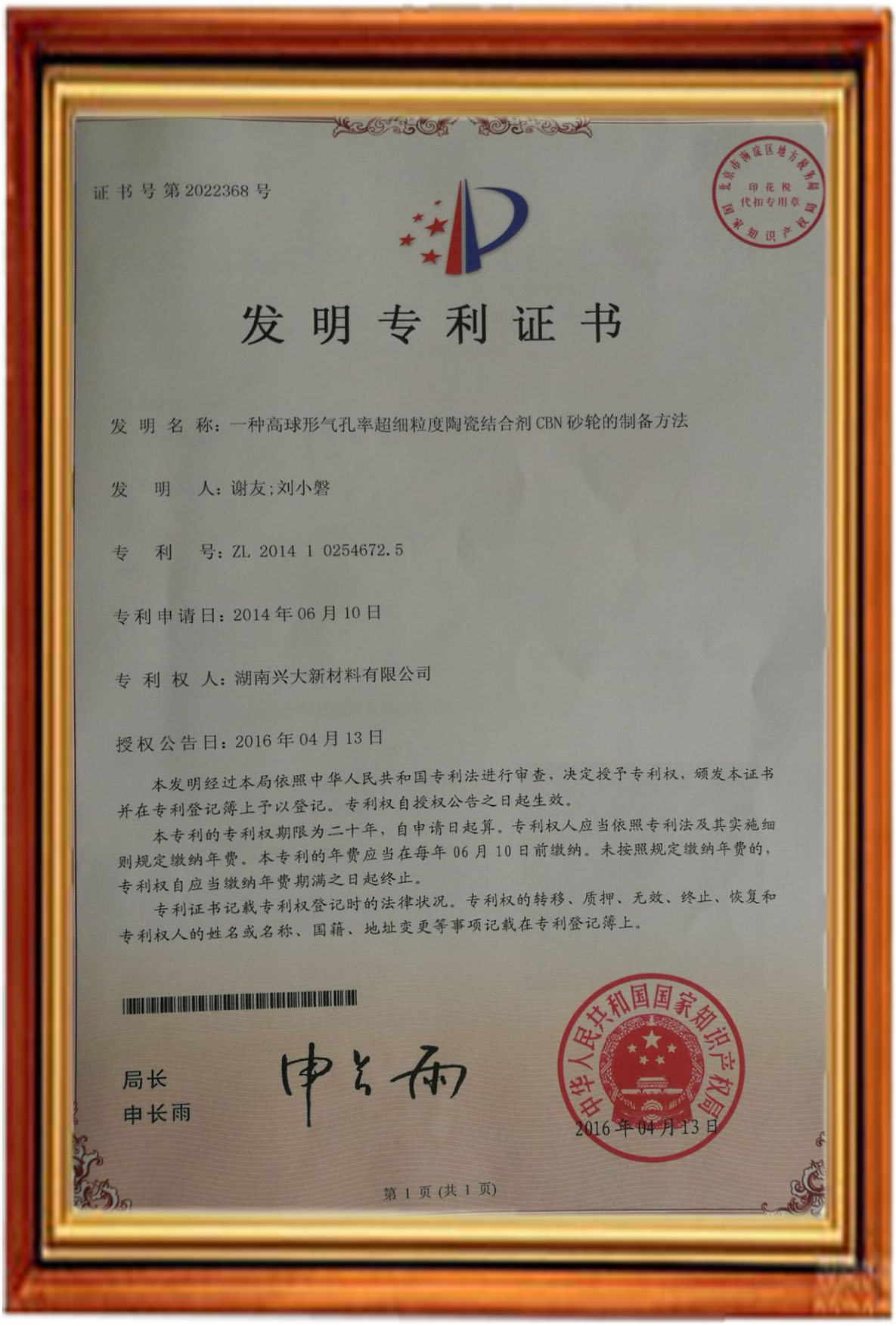 此項(xiàng)發(fā)明專利是研發(fā)人員經(jīng)過反復(fù)改善產(chǎn)品結(jié)構(gòu)、工藝等多次試驗(yàn),克服研發(fā)過程中的眾多困難,成功研發(fā)出“一種高球形氣孔率超細(xì)粒度陶瓷結(jié)合劑CBN砂輪的制備方法”,并獲得國(guó)家知識(shí)產(chǎn)權(quán)局頒發(fā)的發(fā)明專利證書。
