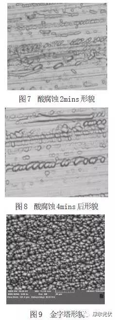 嘗試在酸腐蝕體系 HF 17% - HNO3 50% (體積濃度),溫度7~ 9℃,反應(yīng)時(shí)間 2mins、4mins,目的優(yōu)先腐蝕該金剛石線單晶切片表面斷裂損傷處,水洗后在單晶常規(guī)堿制絨體系中進(jìn)行金字塔生長(如圖 7,8,9)。